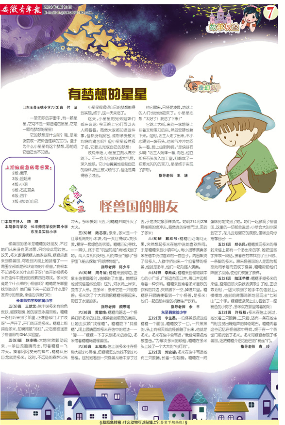 胡说八道 怪兽国的朋友 □本期主持人 糖 糖 本期参与学校 长丰师范学校附属小学 东至县实验小学 怪兽国的多米是糖糖的好朋友,不过她们从来没有见过面,只给彼此写过信。这天,多米邀请糖糖去她家做客,糖糖应邀来到怪兽国,可走到大街上她就懵了——周围全部都是形状奇特的小怪兽。“我根本不知道多米长什么样子呀!”她开始根据多米在信件中提到的线索四处寻找。多米究竟是个什么样的小怪兽呢?糖糖是在哪里找到她的?她们接下来一起做了什么事?发挥你的想象,来信告诉我们吧! 长丰师范学校附属小学 五(5)班 王歆艾:信中说多米有粉色皮肤、蝴蝶翅膀,她的家是水晶宫殿。糖糖一路打听来到了那里,正准备敲门,门“吱呀”一声开了,开门的正是多米。糖糖上前拥抱多米,却瞬间被“冻住”,之后便被送进了怪兽国的DNA实验室。 五(5)班 赵凌楠:大地突然颤动起来,一条巨龙翻腾而出,带着糖糖一飞冲天。摸着闪闪发光的鳞片,糖糖认出巨龙就是多米。这时,不远处的森林火光冲天。多米振翅飞去,和糖糖共同扑灭了大火。 五(5)班 陆芯宸:原来,多米是一个红绿相间的小木块,有一头红得似火的头发,爱穿一套绿色的衣服。糖糖四处寻找,一一辨认,终于在“叽里呱啦”商场找到了她。两人互相问好后,相约乘坐“追月”号宇宙飞船去探秘“月球博物馆”。 指导老师 陈少平 六(6)班 周冬妮:糖糖来到河边,正拿出信要翻看时,信掉进了水里。她惊讶地发现信居然没湿!这时,河水涌上岸来,变成了人形。是多米!原来它是一只液态兽。多米吹了个大泡泡把糖糖包裹起来,带回了水里的家。 指导老师 颜思瑶 六(8)班 黄紫媗:糖糖向路边一个怪兽打听多米的住处,怪兽指指前面的商店,让她去买颗“找怪糖”。糖糖吃下“找怪糖”,闭上眼睛回想多米在信中的描述……“嗖——”糖糖一下子来到多米的身边,多米带着糖糖畅游怪兽国。 六(8)班 王淞然:信上说多米住在怪物大街275号楼,但糖糖怎么也找不到275号楼。这时她看到一只怪兽从墙中穿了过去,于是决定像那样试试。她朝274和276号楼间的墙冲去,竟然真的穿墙而过,见到了多米! 六(8)班 戴欣彤:糖糖四处询问无果,突然想起多米在信中说她喜欢热闹。于是糖糖来到小镇中心,用小提琴演奏多米在信中说过喜欢的一首曲子。周围聚拢了很多人,人群中挤出来一个拉着琴的怪兽,他就是多米,他们一起为路人演奏。 六(8)班 李欣成:糖糖来到怪物城中心的小广场,广场边有五口井,每口井边都堆着一种饮料。糖糖来到堆着多米喜欢的饮料的井边,突然脚下一空,掉进井里。糖糖睁开眼睛便看到一个小怪兽,是多米!他们一起启动井里的机器生产饮料。 指导老师 余 平 东至县实验小学 五(2)班 李芷墨:一位怪兽叔叔送给糖糖一个面包,糖糖咬了一口,一只黑黑的、头上有根天线的怪兽蹦了出来,他就是多米。多米在信中曾写道:“我经常莫名地被雷击。”为解决多米的烦恼,糖糖在多米头上装了一个大大的“电灯泡”。 五(2)班 刘宜鋆:多米在信中写道她有三只眼睛,长着一对翅膀。糖糖在一间蛋糕房前找到了她。她们一起参观了怪兽国,这里的一切都会说话:小草会大叫你踩到它了,花儿会炫耀它的美貌,蛋糕会向你推荐自己…… 五(2)班 郑长民:糖糖发现多米的每封来信上都有一个多出来的字,她把这些字排成一段话,接着在竹林找到了三只眼、一条腿的多米。原来怪兽国的人是因为和巫师闹矛盾而变成了怪兽,糖糖帮助他们降服了巫师,使他们恢复了原样。 五(2)班 陆汪芊檬:糖糖手握多米的来信,路旁的喷火杂技表演吸引了她,正欲靠近时,一团火喷到了她手中的信封上。慢慢地,信封的背面清晰地显现出“七彩山”三个字。糖糖赶紧爬上山,看到了一座粉色的小房子,多米就在那里等着她呢! 五(2)班 许程程:多米在信上说过,她长着三只眼睛、三只脚,还有一条在她生气时会发出鞭炮声的神奇尾巴。糖糖凭着这些记忆在怪兽群中寻找,终于在一个茶馆门前找到了多米。多米带糖糖参观了怪兽国,还把糖糖介绍给自己的“粉丝”们。 指导老师 袁 玲