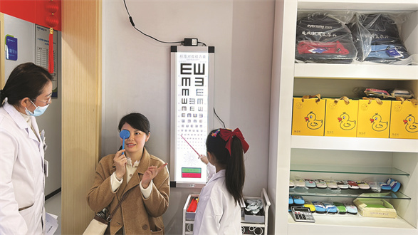 现场最有趣的环节莫过于学生们化身“眼科小医生”,替爸爸妈妈检查视力。“我接过指挥棒,小心翼翼地指着视力表,妈妈跟随我的指挥棒辨别方向,通过检测,她的基本视力情况很快就被测了出来。”学生记者李辰熙乐在其中。