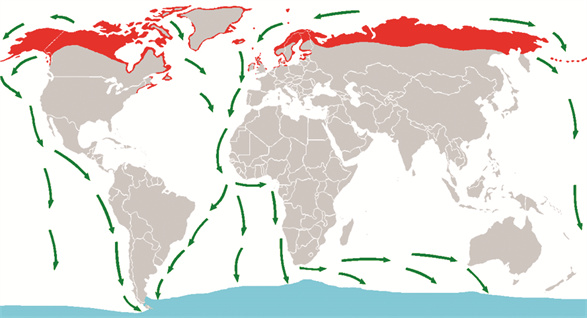 红色为繁殖区,蓝色为越冬地,绿色为迁徙路线