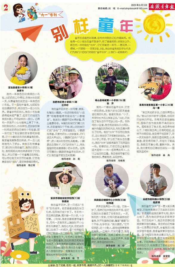 童年的油画色彩斑斓,总有些特别的记忆点缀其间。相信每一位小朋友的童年旅途中,除了爸爸妈妈、好朋友以外,都会有一些特别的“伙伴”,它们可能是一本书、一套玩具、一棵树、一只宠物……本期2版、3版,来自全省各地的学生代表们为我们介绍他们特别的“童年伙伴”,让我们一起瞧瞧吧!