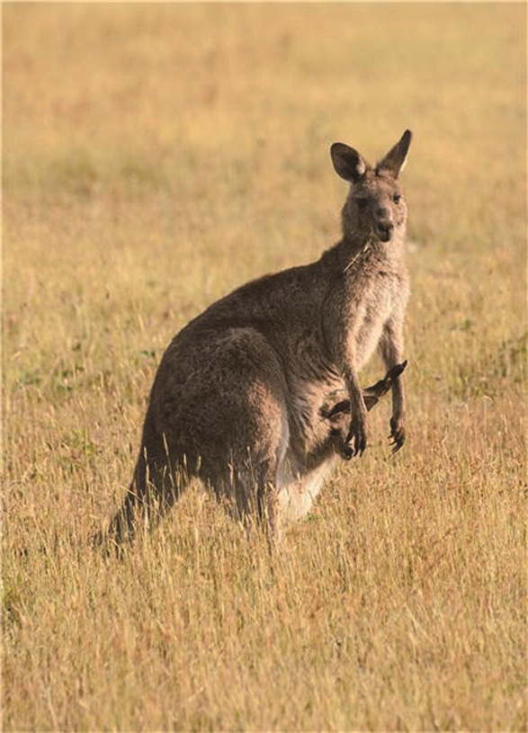 袋鼠的身上没有汗腺,它的四肢上布满可以降温的血管网络。天热时袋鼠会靠近水边,把自己的前臂弄湿来降温,或者用舌头把前臂舔得湿湿的,以达到降温的目的。
