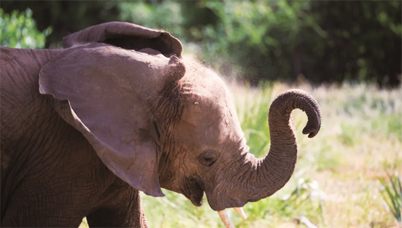 “我散热靠耳朵,宽大的耳朵就像两把大扇子一样为我扇风,帮助身体散发热量,以降低体温。”大象的耳朵就像两把蒲扇,里面含有丰富的血管,当血液流入耳朵,大象会扇动大耳朵把热量散发出去。大象还会用鼻子吸水来给自己降温,既能驱赶蚊虫,又能散热。