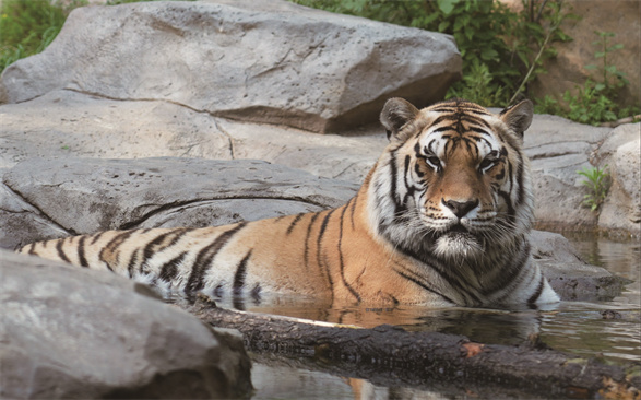 老虎算是森林里排得上名号的“怕热人士”,因为它们缺少汗腺,一到夏天他们就失去了以往的威风,四处找树荫躲着避暑。除此之外,老虎是一种喜水的大型猫科动物,它们的游泳技术十分高超,在酷暑季节,它们十分喜欢游水嬉戏。瞧!大太阳底下,老虎就一头扎在水池里泡澡降温,只露出个虎脑袋,看起来非常呆萌,哪里有往日的霸气?