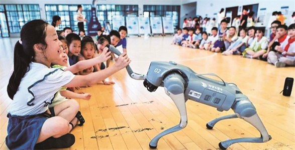 岳西县菖蒲中心学校 “科普大篷车” 点亮科技梦 □张 烁 吴承东 近日,安庆市科技馆到岳西县菖蒲中心学校开展“科普大篷车”进校园活动,为500多名学子带来一场趣味十足的科技盛宴。科普展品展览互动活动中,多媒体、实物模型交互展示科技原理,同学们零距离接触了解无人驾驶、人工智能、AI换装、仿生机械手、远程医疗等前沿高科技,外形逼真、敏锐感知周围环境的机器狗表演倍受欢迎,引来同学们阵阵喝彩,激发了同学们的好奇心和求知欲。 机器狗表演
