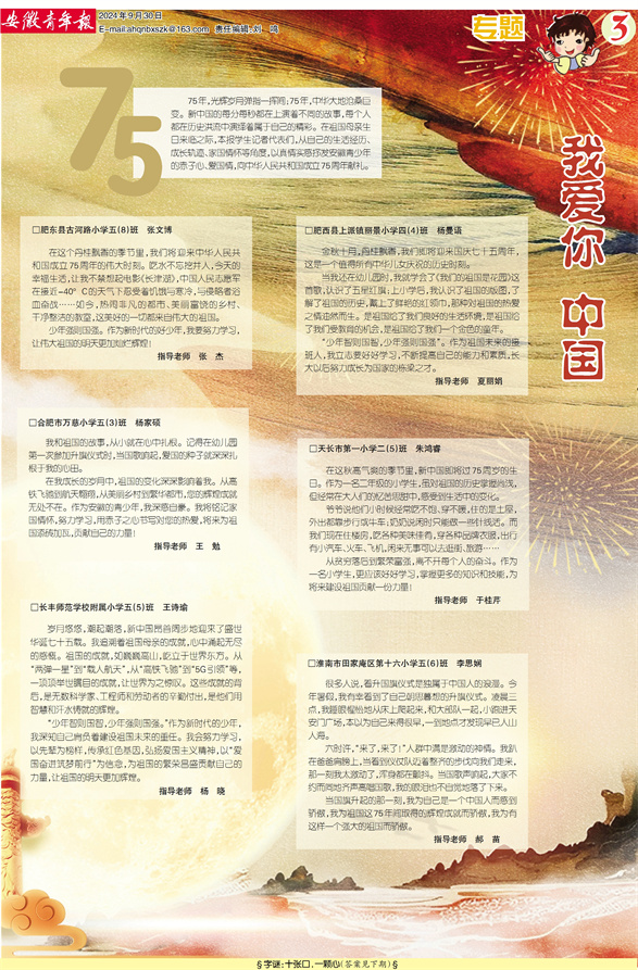 75年,光辉岁月弹指一挥间;75年,中华大地沧桑巨变。新中国的每分每秒都在上演着不同的故事,每个人都在历史洪流中演绎着属于自己的精彩。在祖国母亲生日来临之际,本报学生记者代表们,从自己的生活经历、成长轨迹、家国情怀等角度,以真情实感抒发安徽青少年的赤子心、爱国情,向中华人民共和国成立75周年献礼。