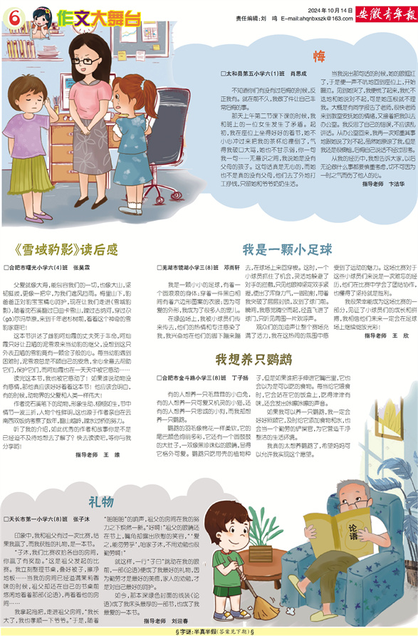 《安徽青年报·学生周刊》励志启智,开阔视野,净化心灵,陶冶情操,参与互动,集新闻性、知识性、趣味性、互动性为一体,是小学生成长的良师益友、参与互动的平台、沟通老师家长的纽带。