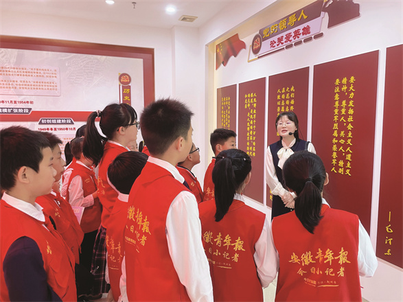 活动当天,一踏入展陈馆的大门,一面鲜红的党旗映入眼帘,学生记者们便被这庄严的氛围深深震撼,大家在党旗下驻足,心中不禁涌起一股莫名的激动与敬仰。在讲解员余锦阿姨的引领下,学生记者们开始了今天的红色探索之旅。