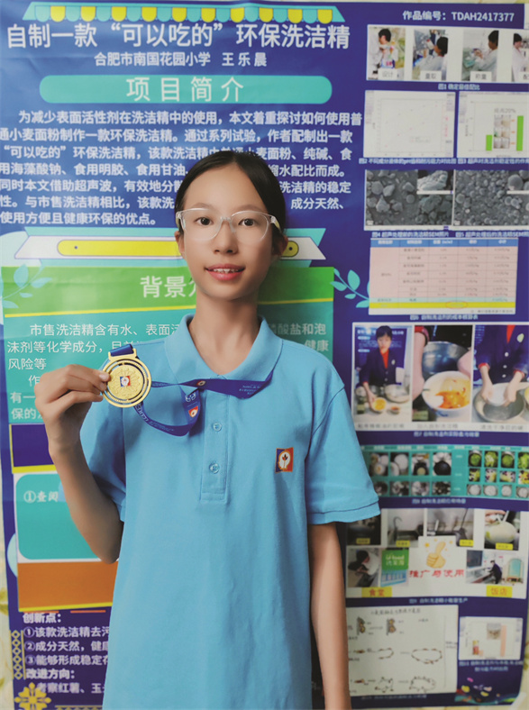 2024年7月,王乐晨凭借其作品《自制一款“可以吃的环保洗洁精”》在青少年科技创新成果竞赛中脱颖而出,荣获全国青少年科技创新成果一等奖!