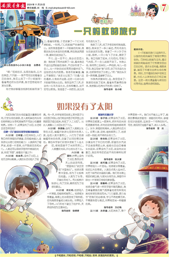 胡说八道 如果没有了太阳 太阳对我们的生命起着至关重要的作用,它是生命的源泉,是人类和其他有生命的物种赖以生存和发展而不可缺少的重要物质。试想一下,如果没有了太阳,生活将会是怎样的呢? 合肥一六八新店花园学校陶冲湖校区 六(2)班 江梓萱:太阳消失后,人们整日待在黑暗的环境里,交流越来越少,逐渐进化出夜行动物的能力!人类拥有了超声波,即使一片漆黑,也不影响交流和出行。人类还可以吸收宇宙用中微弱的光波,形成“天眼”,能看到千里之外! 六(2)班 陈自昂:没有了太阳,土地无法种出粮食,人类的生活也陷入了绝境。有一天,科学家发现地球上某些因子与太阳因子相似,他们将这些因子和宇宙上的残留因子组合起来,形成了“人工太阳”。从此人类靠人工太阳生活了下去。 六(2)班 李潇瀚:没有了人类赖以生存的太阳,蝙蝠开始进化变异并伤害人类,造成人类大量死亡。人们为了抵御蝙蝠带来的伤害,创建了封闭的穹顶基地。最后科学家们研发并发射了人造太阳,怪物因受不了光照而死亡。人类重获光明,开心地生活下去。 六(2)班 张震轩:世界上没有了太阳,整天挂在天上的就是月亮,“温室效应”就会变成“冷室效应”。地球表面寒冷至极,成为了北极熊的地盘。人类为了生存,只能住在地下。而北极熊开始进化,有了文明,最终成为了地球的霸主。 六(2)班 郑文硕:地球陷入一片黑暗,动植物相继死亡。地球被冰雪覆盖,海面上的冰层变成了隔热层,仅有海底存着部分微生物。世界陷入了恐慌,人们在地下建立了庇护所,天然地热成为主要供给。 指导老师 徐婷婷 桐城市文昌小学 五(2)班 徐子宸:如果没有了太阳,世界将会被蒙上一层黑布,把所有的光明和温暖都带走,所有的动物和植物都将死亡。冰冷、黑暗即将涌来,人类自然也会灭亡。如果人类、动物、植物都死亡了,地球从那一刻起,将不再有生命力了。 五(2)班 李诗清:如果没有了太阳,沙漠没有了烈日的灼晒,那里的水汽就不会蒸发得那么快,植被也会自己慢慢生长起来;如果没有了太阳,就没有炎炎夏日,我的爷爷奶奶就不用在耕种时挥汗如雨。 指导老师 张大寨 五(4)班 姚可馨:如果没有了太阳,世界将陷入一片混沌。地球被冰雪覆盖,宛如巨大的雪球。人类会点亮人造光灯,光芒下城市如水晶般闪耀。我们在冰原上驾驭机械巨兽,与发光生物为友,黑暗中开辟出一片璀璨又神奇的新家园。 五(4)班 琚春晖:如果没有了太阳,地球会像气球一样在宇宙中随风飘摇,我会背着便携的氧气瓶乘着地球列车观光其他星球的美丽风光。“行万里路,读万卷书”是我们的必修课,学习不再枯燥无味,不需要熬夜与考试,世界将是另一种健康的美。 指导老师 方红梅 五(1)班 洪承奎:太阳消失了,整个世界漆黑一片。我们也不能去上学了,能做的事情就是睡觉!谁睡的时间长,掌握的知识就越多,这真是一个特殊的时代。可是,我现在已经睡不着了,真让人头疼。 指导老师 雷 欣