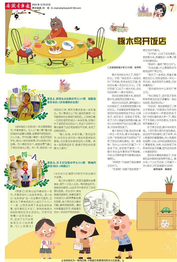 啄木鸟开饭店 □太湖县新城小学三(3)班 胡宇阳 啄木鸟当医生当久了,想换个职业。它想:“我还是开一家饭店吧!”它相信,在未来的日子里,饭店的生意一定会红红火火。于是它在家门口挂了一块大大的、金灿灿的招牌——啄木鸟饭店。 饭店的老板是啄木鸟,厨师是啄木鸟,服务员还是啄木鸟。 饭店开业的这天,森林里的小伙伴都来了,大家都想尝尝啄木鸟的手艺。大家拿起菜单准备点菜,发现所有的菜都和虫子有关:红烧虫子、油炸虫子、清蒸虫子等等。除了几只小黄雀对菜肴感兴趣,其他小伙伴都找不到合自己胃口的菜,只好失望地走了。 接下来的日子里,饭店的生意一天比一天冷清,啄木鸟很着急,心想:“是我做的菜不好吃吗?”它尝了尝自己做的食物。呀!真美味!为什么小伙伴们只看了一下就走了呢,连尝都不愿尝一下。啄木鸟对这件事百思不得其解,只好去问森林里学问最高的猫头鹰博士。 “咚咚咚!”它敲响了猫头鹰博士的大门。 “是谁啊?吵醒了我的美梦!”博士有点不高兴。 “对不起!打扰了您的美梦,我是啄木鸟,想请教您一件事。”啄木鸟抱歉地说。 “那好吧!请进!”博士打开门。 “你说说看,什么事情把你为难成这样?”博士问。 “我开了一家饭店,想着生意肯定会红火,可是没想到一天比一天冷清。我实在找不出原因,只好来请教您。” “那你都有些什么菜呢?”博士问。 “有红烧虫子、油炸虫子等各种各样做法的虫子美餐呀!真的很好吃,我还尝过呢。” “哈哈哈!我知道原因了。”博士大笑起来,“你难道认为所有的小伙伴都像你一样喜欢吃虫子吗?你饭店里的菜太单一了,满足不了大多数小伙伴的要求,大家当然不愿意来了。” 听了博士的话,啄木鸟恍然大悟。于是它虚心询问大家的喜好,到处找不同的食材,改了菜单,有小熊喜欢的蜂蜜蛋糕,有小兔喜欢的胡萝卜沙拉,还有松鼠喜欢的松仁果酱等等,当然,也还保留了各种各样的虫子美餐,因为还有很多小鸟喜欢吃呢! 饭店的生意越来越好了,大家都对这些美味的菜肴赞不绝口。啄木鸟一个人忙不过来,于是请了一些小助手,它们还准备开分店呢! 指导老师 殷桃玲