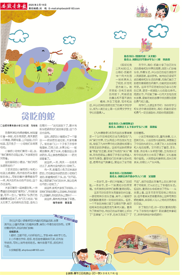 贪吃的蛇 □合肥市青年路小学三(6)班 马依依 在森林深处有棵老槐树,树洞里住着一条蛇,他非常贪吃,每天要吃一只青蛙、两颗鸟蛋、三只田鼠、四只松鼠、五只兔子……小动物们非常害怕他。 小猴把小动物们聚在一起,说:“我们要想办法阻止蛇。”大家都苦思冥想着。 这时聪明的小鹿说:“我们用石头砸死他吧!” 于是灵活的小猴带领小鸟和小松鼠去偷袭蛇,雨点般的石头落在蛇的身上,可蛇的鳞片硬得像盔甲一样,再大的石头也伤不到他,这个办法没用。 大家又聚在一起商量对策,一些勇猛的动物组成“敢死队”,冲到蛇家里,可不一会儿,“敢死队”队员们伤痕累累地回来了,有气无力地说:“蛇太厉害了,他有锋利的牙齿、强有力的尾巴……”说完就倒下了,啄木鸟医生赶紧把他们送到急诊室,这个办法也没用。 这时,贪吃的小猪提出了一个建议——把好吃的送给蛇,大家同意了。蛇的家门口一下子多了许多草莓蛋糕、巧克力派、水果沙拉……蛇闻到香味,爬了出来,他看到这么多好吃的,马上狼吞虎咽起来……吃完就睡着了。 就这样,一天、两天……很多天过去了,蛇再也没有吃过小动物了。 有一天,蛇看见小兔子过来送好吃的,才知道这些好吃的是小动物们送的,蛇羞愧地低下头,说:“对不起,我之前吃掉了你们的伙伴,我以后再也不吃小动物了。” 就这样,蛇和大家成了好朋友,小动物们在蛇的尾巴上玩滑梯,在他的肚子上玩蹦床,在他的舌头上荡秋千…… 就这样,森林再次恢复了平静。 指导老师 曹呈茵