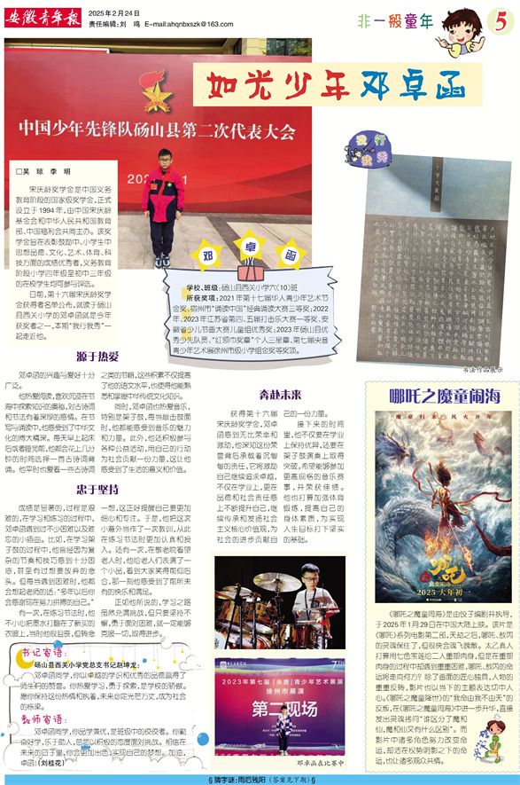 所获奖项:2021年第十七届华人青少年艺术节金奖、宿州市“诵读中国”经典诵读大赛三等奖;2022年、2023年江苏省第四、五届打击乐大赛一等奖、安徽省少儿书画大赛儿童组优秀奖;2023年砀山县优秀少先队员、“红领巾奖章”个人三星章、第七届央音青少年艺术展徐州市级小学组金奖等奖项。