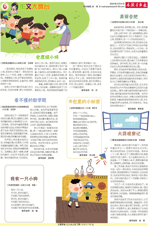 《安徽青年报·学生周刊》励志启智,开阔视野,净化心灵,陶冶情操,参与互动,集新闻性、知识性、趣味性、互动性为一体,是小学生成长的良师益友、参与互动的平台、沟通老师家长的纽带。