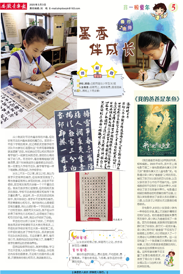 冰冻三尺非一日之寒,练习之初,我以为练字只是简单的模仿,但很快发现我错了。每当我拿起笔想认真写的时候,手总是不听使唤,那支笔对我而言好像一个千斤重的负担。我曾无数次想打退堂鼓,但在妈妈无数次的鼓励、学校书法老师的肯定和指导下我又重拾勇气。就这样,在一次次的尝试和失败中,我开始明白:练字并不是简单的模仿,而是需要耐心和专注。我开始用心去感受那支笔的重量,用心去倾听每一个字的呼吸,这个过程是漫长、艰难而又充实的,我不但从中获得了练字的方法和技巧,还领悟到了耐心和专注的价值,当然,我还从中收获了自信。