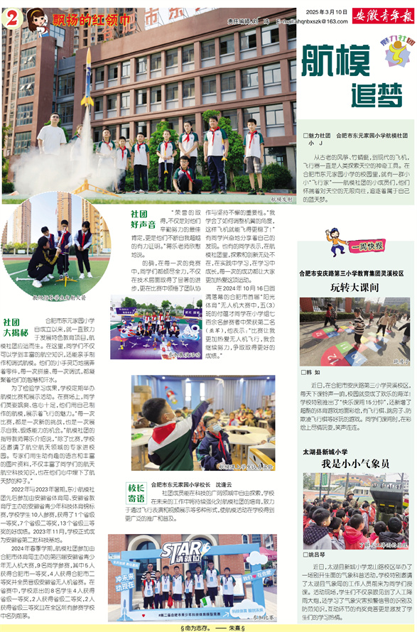 从古老的风筝、竹蜻蜓,到现代的飞机,飞行器一直是人类探索天空的神奇工具。在合肥市东元家园小学的校园里,就有一群小小“飞行家”——航模社团的小成员们,他们怀揣着对天空的无限向往,追逐着属于自己的蓝天梦。
