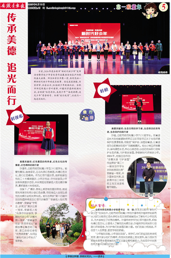 合肥市师范附属小学党委书记 冯 璐:在本次合肥市“新时代好少年”的评选中,合肥市师范附属小学的叶谨希和叶檀同学脱颖而出,他们分别在红色传承和生态文明领域展现出了新时代少年的风采,为大家树立了优秀的榜样。叶谨希同学作为红领巾宣讲员,积极传播红色文化,让更多人了解党的光辉历史;叶檀同学则用实际行动践行环保理念,为守护我们的家园贡献力量。他们的努力和成就,不仅是个人的荣誉,更是学校的骄傲。
