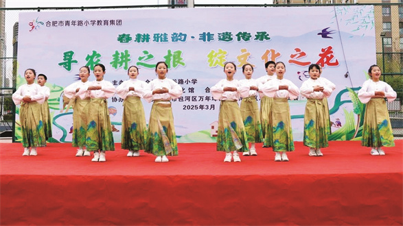 合肥市青年路小学教育集团云谷路小学执行校长徐来燕称,学生是文化根脉的守护者,学校将非遗主题融入全年“四周五节”活动,让学生们在劳动中领悟创造幸福的意义,成为非遗传承的实践者,并于动手体验中点亮非遗文化明珠,让中华优秀传统文化绽放新的光彩。