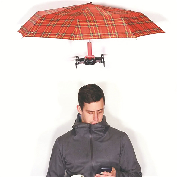 这是一把安装在无人机上的伞,无人机上的智能程序能识别并追随使用者的头部,在使用者头顶上方悬停,和使用者同步移动。无人机高速旋转的螺旋桨还能起到风扇的效果,在闷热的天气给使用者送去阵阵微风。
