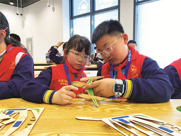 讲解员阿姨穿梭在座位间,时不时地查看大家的进度,手把手教学生记者们怎么组装。看着一堆木片零件变成“流线型”飞机,学生记者们成就感满满!杨一凡说:“通过制作航模,我不仅锻炼了自己的动手能力,培养了耐心, 还学习到了很多关于飞机的结构、原理等方面的知识。”