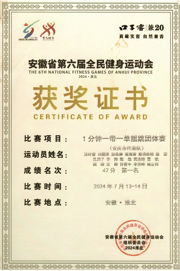 拿到“安庆绳王”奖时,我的手心还在冒汗,但心里特别踏实。比赛最后一分钟,我听到队友和老师喊我的名字,突然想起训练时受过的伤、数过的绳响,还有老师们被夕阳拉长的影子。最终大屏幕的数字定格在962,我赢了!这个奖其实是一群人的“接力赛”:是爸爸换掉我断掉的钢丝绳,是同学帮我补习上训练耽误的功课,是老师用休息时间陪我加练的每一分钟。