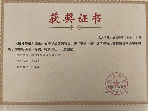 2025年2月荣获滁州市第五届中小学生“书香滁州”征文比赛二等奖……