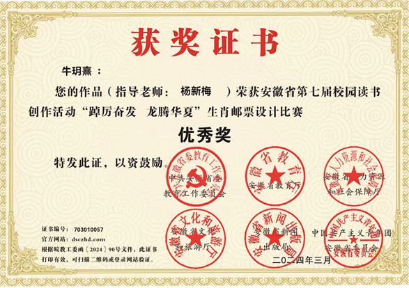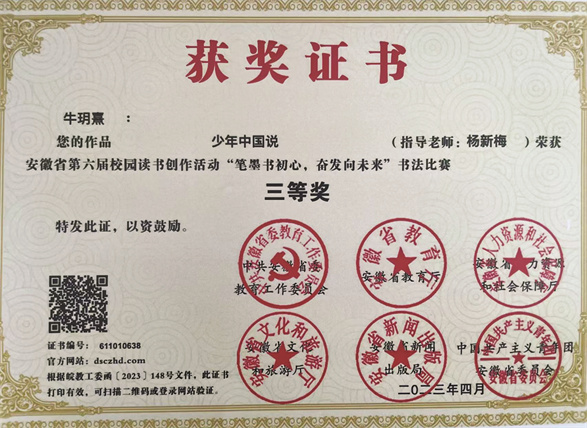 2023年4月荣获安徽省第六届校园读书创作活动“笔墨书初心,奋发向未来”书法比赛三等奖