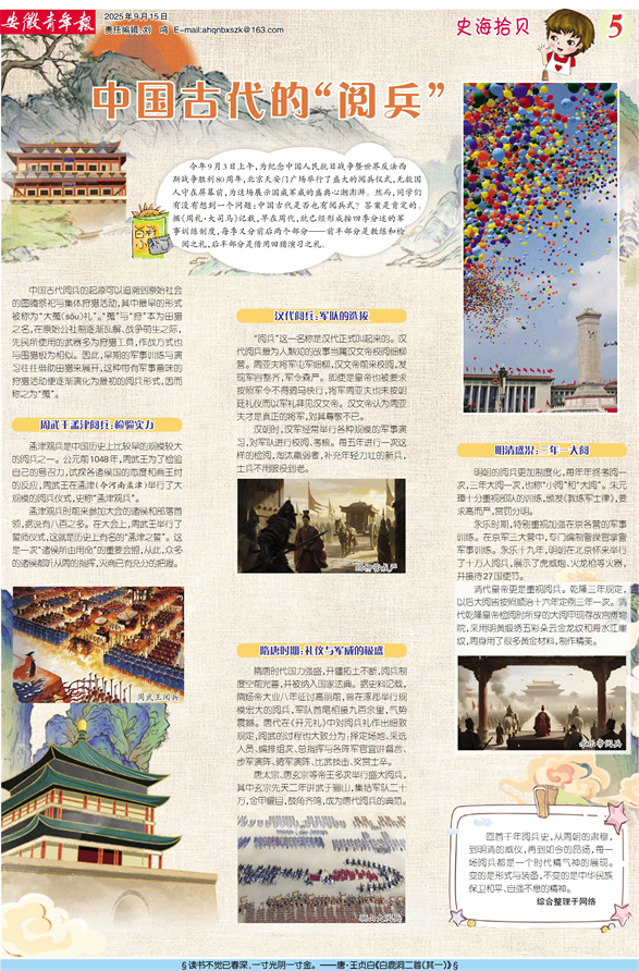 今年9月3日上午,为纪念中国人民抗日战争暨世界反法西斯战争胜利80周年,北京天安门广场举行了盛大的阅兵仪式,无数国人守在屏幕前,为这场展示国威军威的盛典心潮澎湃。然而,同学们有没有想到一个问题:中国古代是否也有阅兵式?答案是肯定的。据《周礼·大司马》记载,早在周代,就已经形成按四季分述的军事训练制度,每季又分前后两个部分——前半部分是教练和检阅之礼,后半部分是借用田猎演习之礼。
