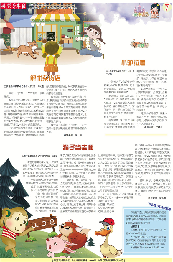 《安徽青年报·学生周刊》励志启智,开阔视野,净化心灵,陶冶情操,参与互动,集新闻性、知识性、趣味性、互动性为一体,是小学生成长的良师益友、参与互动的平台、沟通老师家长的纽带。