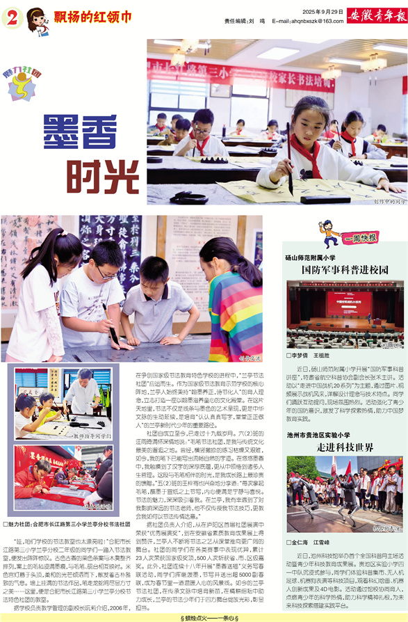 魅力社团 墨香时光 □魅力社团:合肥市长江路第三小学兰亭分校书法社团 “哇,咱们学校的书法教室也太漂亮啦!”合肥市长江路第三小学兰亭分校二年级的同学们一踏入书法教室,便发出阵阵惊叹。古色古香的栗色条案与木凳整齐排列,案上的毛毡浸满墨痕,与毛笔、砚台相互映衬。米色宫灯悬于头顶,柔和的光芒倾洒而下,散发着古朴雅致的气息。墙上挂满的书法作品,笔走龙蛇间尽显方寸之美……这里,便是合肥市长江路第三小学兰亭分校书法特色社团的教室。 据学校负责教学管理的副校长阮莉介绍,2006年,在争创国家级书法教育特色学校的进程中,“兰亭书法社团”应运而生。作为国家级书法教育示范学校的核心阵地,兰亭人始终秉持“翰墨养正,诗书化人”的育人理念,立志打造一座以翰墨滋养童心的文化殿堂。在这片天地里,书法不仅是线条与墨色的艺术呈现,更是中华文脉的生动延续,是培育“认认真真写字,堂堂正正做人”的兰亭新时代少年的重要路径。 社团自成立至今,已走过十九载岁月。六(2)班的汪雨琦满怀深情地说:“毛笔书法社团,是我与传统文化最美的邂逅之地。曾经,横竖撇捺的练习枯燥又艰难,如今,我的笔下已能写出流畅自然的字迹。在悠悠墨香中,我触摸到了汉字的深厚底蕴,更从中领悟到诸多人生哲理。这段与毛笔相伴的时光,是我成长路上最珍贵的馈赠。”五(2)班的王梓骞也兴奋地分享道:“每次拿起毛笔,蘸墨于宣纸之上书写,内心便满是宁静与喜悦。书法的魅力,深深吸引着我。在兰亭,我有幸遇到了对我影响深远的书法老师,他不仅传授我书法技巧,更教会我如何以书法传情达意。” 据社团负责人介绍,从在庐阳区首届社团展演中荣获“优秀展演奖”,到在安徽省素质教育成果展上得到赞许,兰亭人不断将书法之艺从课堂推向更广阔的舞台。社团的同学们在各类赛事中表现优异,累计23人次荣获国家级奖项,500人次斩获省、市、区级嘉奖。此外,社团连续十八年开展“墨香送福”义务写春联活动,同学们挥毫泼墨,书写并送出超5000副春联,成为春节里一道温暖人心的风景线。如今的兰亭书法社团,在传承文脉中培育新苗,在精耕细耘中助力成长,兰亭的书法少年们于四方舞台绽放光彩,彰显担当。