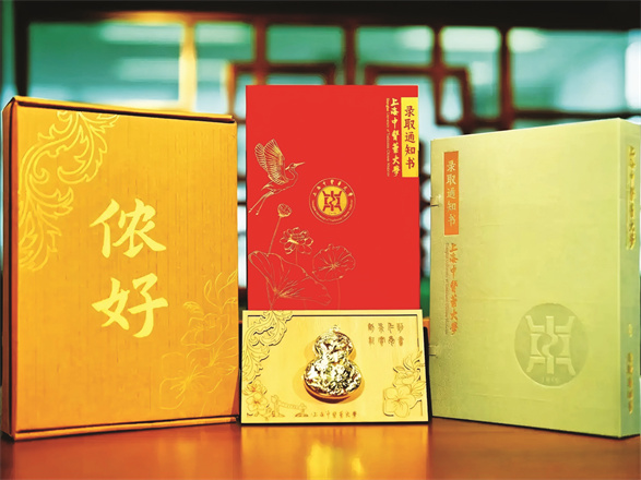 这是一份特别的录取通知书,潞绸封上复旦建校120周年标识创新演绎传统“龙凤戏珠”图案,烫金的复旦百廿logo印在封底,新生们拿到的每一份都是建校120周年的限定款。